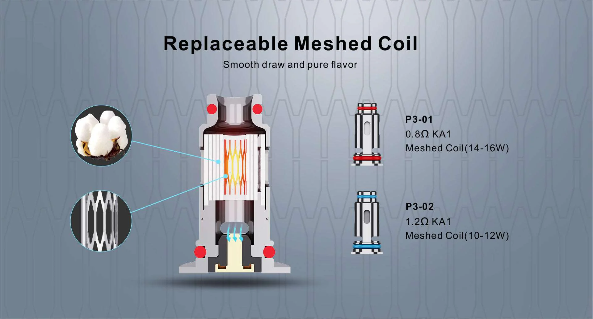 P3-01 0.8ohm KA1 網狀線圈(14-16W) P3-02 1.2ohm KA1 網狀線圈(10-12W)